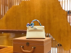 品牌:Hermès(爱马仕);类别:MiniKelly 迷你凯莉;颜色:奶昔白;材质:Epsom 掌纹小牛皮;等级:顶级;附件:全套包装礼盒;尺寸:19cm;功能:单肩背包