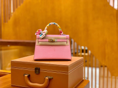 Hermès(爱马仕)迷你2代 19cm 樱花粉 金扣 南非野生蜥蜴皮 全手工缝制