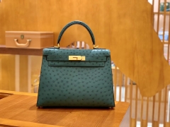 Hermès(爱马仕)Kelly 28cm 孔雀绿 金扣 南非进口 鸵鸟皮 全手工缝制