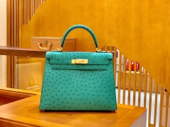 Hermès(爱马仕)Kelly 28cm 湖水绿 金扣 南非KK鸵鸟皮 全手工缝制