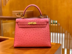 Hermès(爱马仕)Kelly 凯莉包 唇膏粉 樱花粉 鸵鸟皮 全手工缝制 金扣 28cm 现货