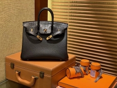Hermès(爱马仕)Birkin 铂金包 经典黑 鳄鱼皮拼德国togo牛皮 全手工缝制 金扣 25cm