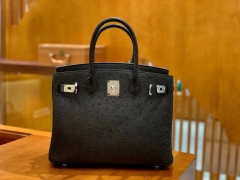 Hermès(爱马仕)Birkin 铂金包 黑色 鸵鸟皮 手缝工艺 银扣 30cm 现货