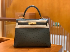 Hermès(爱马仕)Kelly 凯莉包 松柏绿 鸵鸟皮 全手工缝制 金扣 28cm 现货