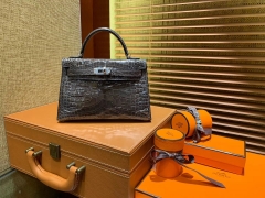Hermès(爱马仕)Mini Kelly 沥青灰 一级美洲鳄鱼皮 全手工缝制 臻品级别 金扣 19cm 2代