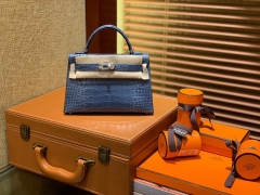 Hermès(爱马仕)Mini Kelly 牛仔蓝 一级美洲鳄鱼皮 全手工缝制 臻品级别 银扣 19cm 2代